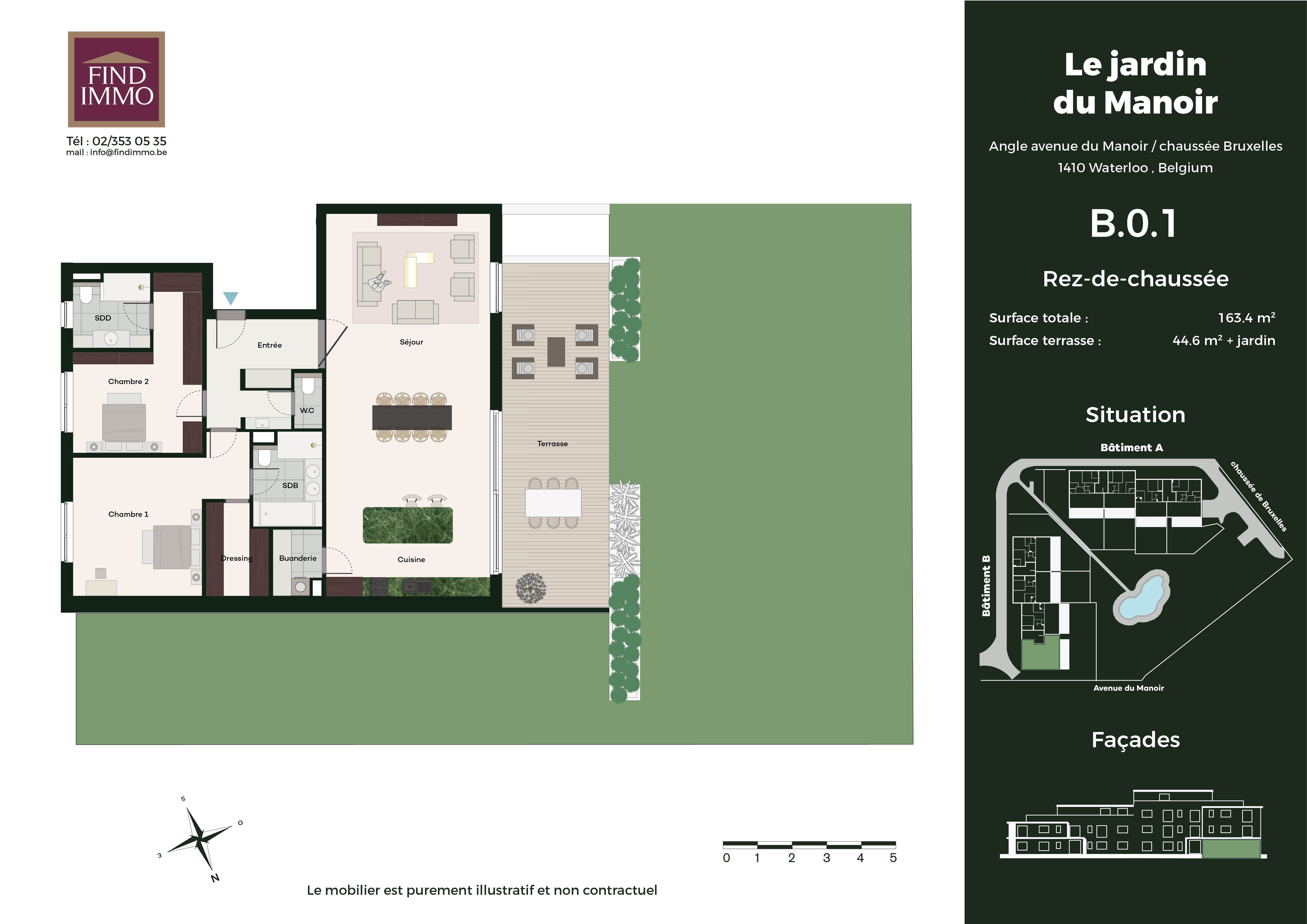 www.lejardindumanoir.be Waterloo - Quartier du Manoir - dans un nouveau projet immobilier de prestige : Appartement de 163m2 au rez-de-chaussée avec terrasse de +/-42m2 + jardin privatif de + de 200m2. le logement se compose d'un hall d'entrée avec espace vestiaire et toilette invité, spacieux séjour ouvert sur une magnifique cuisine, buanderie, deux suites avec dressing et salle de bains ou salle de douche. Cet ensemble résidentiel offre un cadre de vie exceptionnel, alliant confort, sécurité, modernité et sérénité. Chaque appartement spacieux pensé pour offrir un bien-être optimal, dispose d'une grande terrasse et d'un jardin privatif pour les rez-de-chaussée, idéal pour profiter des beaux jours. Les résidents pourront se promener autour d'un étang pittoresque et bénéficier de chemins aménagés pour des balades. Avec des finitions luxueuses et des prestations de qualité, ce projet pourra répondre aux attentes des plus exigeants. Situé dans un quartier résidentiel calme et réputé pour son cadre de vie agréable, il allie à la perfection tranquillité et proximité des commodités. Ne manquez pas l'opportunité de vivre dans cet écrin de verdure, où chaque détail a été pensé pour vous offrir un quotidien des plus agréable. Air conditionné, chauffage au sol, triple vitrage, porte blindée, finitions haut de gamme au choix, .... Chaque appartement disposera d'un box deux voitures et d'une cave en sous-sol. N'hésitez pas à nous contacter afin de discuter de ce projet unique. FINDIMMO 02/353 05 35 - info@findimmo.be