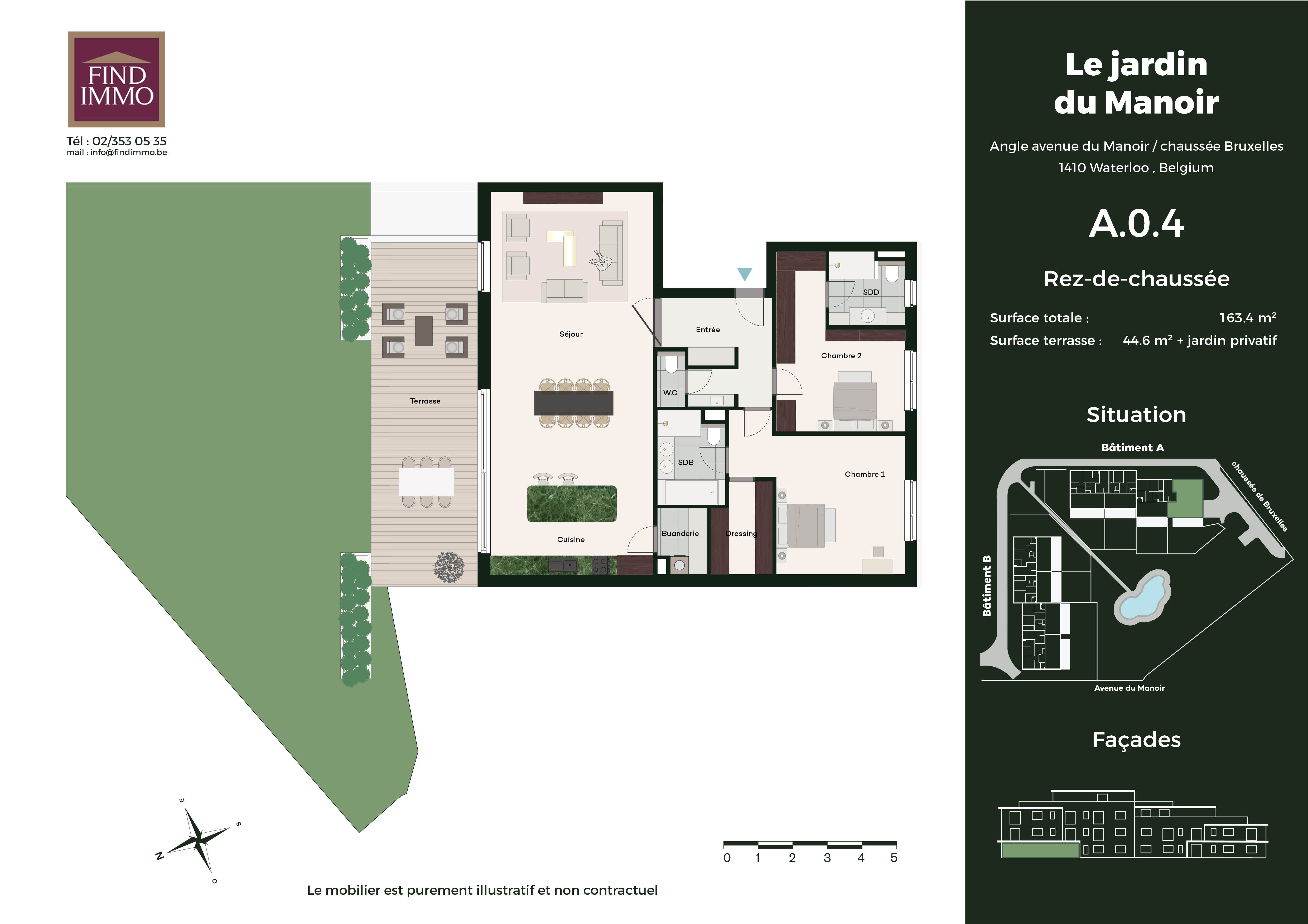 www.lejardindumanoir.be Waterloo - Quartier du Manoir - dans un nouveau projet immobilier de prestige : Appartement de 163m2 au rez-de-chaussée avec terrasse de +/-45m2 + jardin privatif. le logement se compose d'un hall d'entrée avec espace vestiaire et toilette invité, spacieux séjour ouvert sur une magnifique cuisine, buanderie, deux suites avec dressing et salle de bains ou douche. Cet ensemble résidentiel offre un cadre de vie exceptionnel, alliant confort, sécurité, modernité et sérénité. Chaque appartement spacieux pensé pour offrir un bien-être optimal, dispose d'une grande terrasse et d'un jardin privatif pour les rez-de-chaussée, idéal pour profiter des beaux jours. Les résidents pourront se promener autour d'un étang pittoresque et bénéficier de chemins aménagés pour des balades. Avec des finitions luxueuses et des prestations de qualité, ce projet pourra répondre aux attentes des plus exigeants. Situé dans un quartier résidentiel calme et réputé pour son cadre de vie agréable, il allie à la perfection tranquillité et proximité des commodités. Ne manquez pas l'opportunité de vivre dans cet écrin de verdure, où chaque détail a été pensé pour vous offrir un quotidien des plus agréable. Air conditionné, chauffage au sol, triple vitrage, porte blindée, finitions haut de gamme au choix, .... Chaque appartement disposera d'un box deux voitures et d'une cave en sous-sol. N'hésitez pas à nous contacter afin de discuter de ce projet unique. FINDIMMO 02/353 05 35 - info@findimmo.be