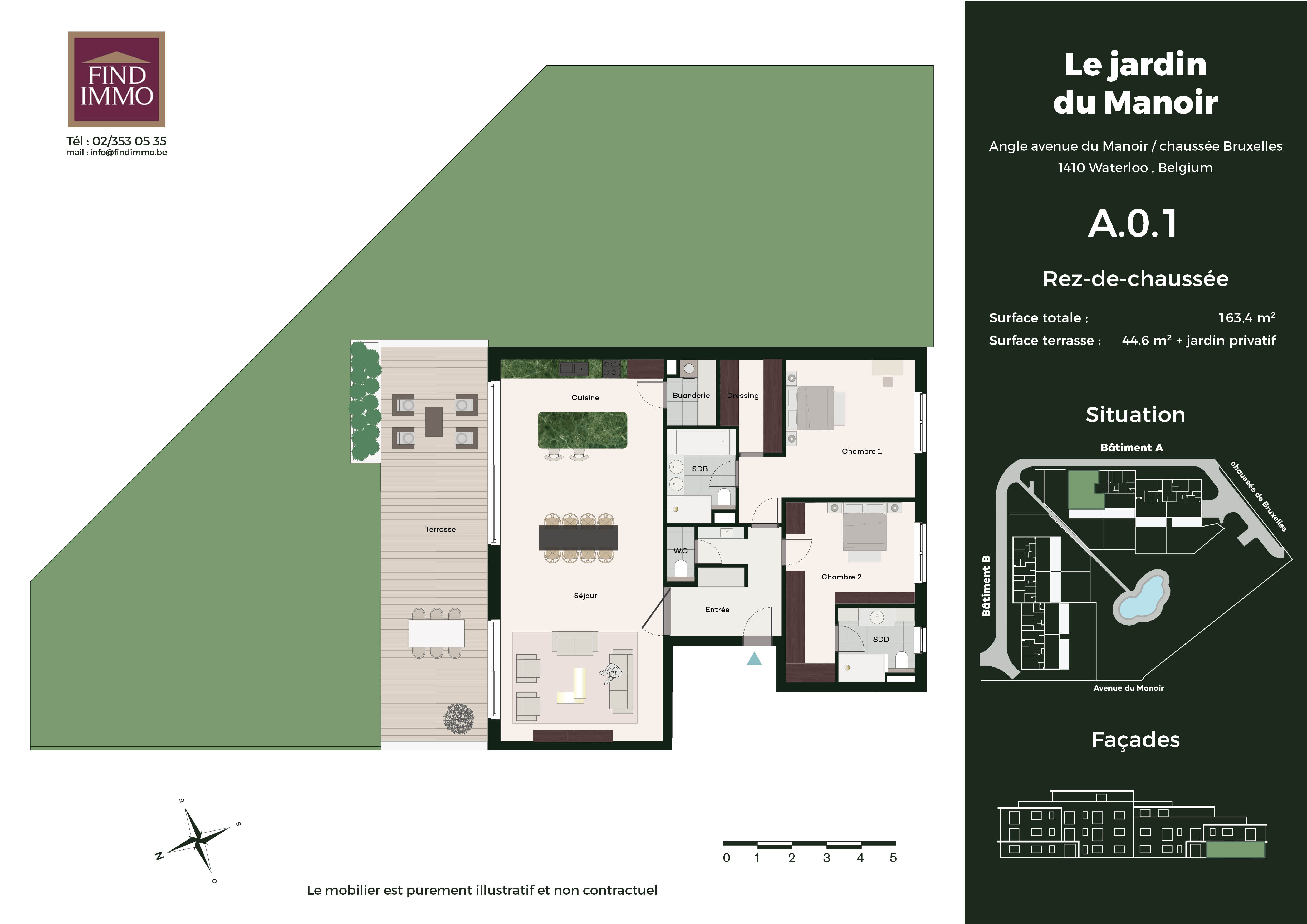 www.lejardindumanoir.be Waterloo - Quartier du Manoir - dans un nouveau projet immobilier de prestige : Appartement de 163m2 au rez-de-chaussée avec terrasse de +/-42m2 + jardin privatif de 200m2. le logement se compose d'un hall d'entrée avec espace vestiaire et toilette invité, spacieux séjour ouvert sur une magnifique cuisine, buanderie, deux suites avec dressing et salle de bains ou salle de douche. Cet ensemble résidentiel offre un cadre de vie exceptionnel, alliant confort, sécurité, modernité et sérénité. Chaque appartement spacieux pensé pour offrir un bien-être optimal, dispose d'une grande terrasse et d'un jardin privatif pour les rez-de-chaussée, idéal pour profiter des beaux jours. Les résidents pourront se promener autour d'un étang pittoresque et bénéficier de chemins aménagés pour des balades. Avec des finitions luxueuses et des prestations de qualité, ce projet pourra répondre aux attentes des plus exigeants. Situé dans un quartier résidentiel calme et réputé pour son cadre de vie agréable, il allie à la perfection tranquillité et proximité des commodités. Ne manquez pas l'opportunité de vivre dans cet écrin de verdure, où chaque détail a été pensé pour vous offrir un quotidien des plus agréable. Air conditionné, chauffage au sol, triple vitrage, porte blindée, finitions haut de gamme au choix, .... Chaque appartement disposera d'un box deux voitures et d'une cave en sous-sol. N'hésitez pas à nous contacter afin de discuter de ce projet unique. FINDIMMO 02/353 05 35 - info@findimmo.be