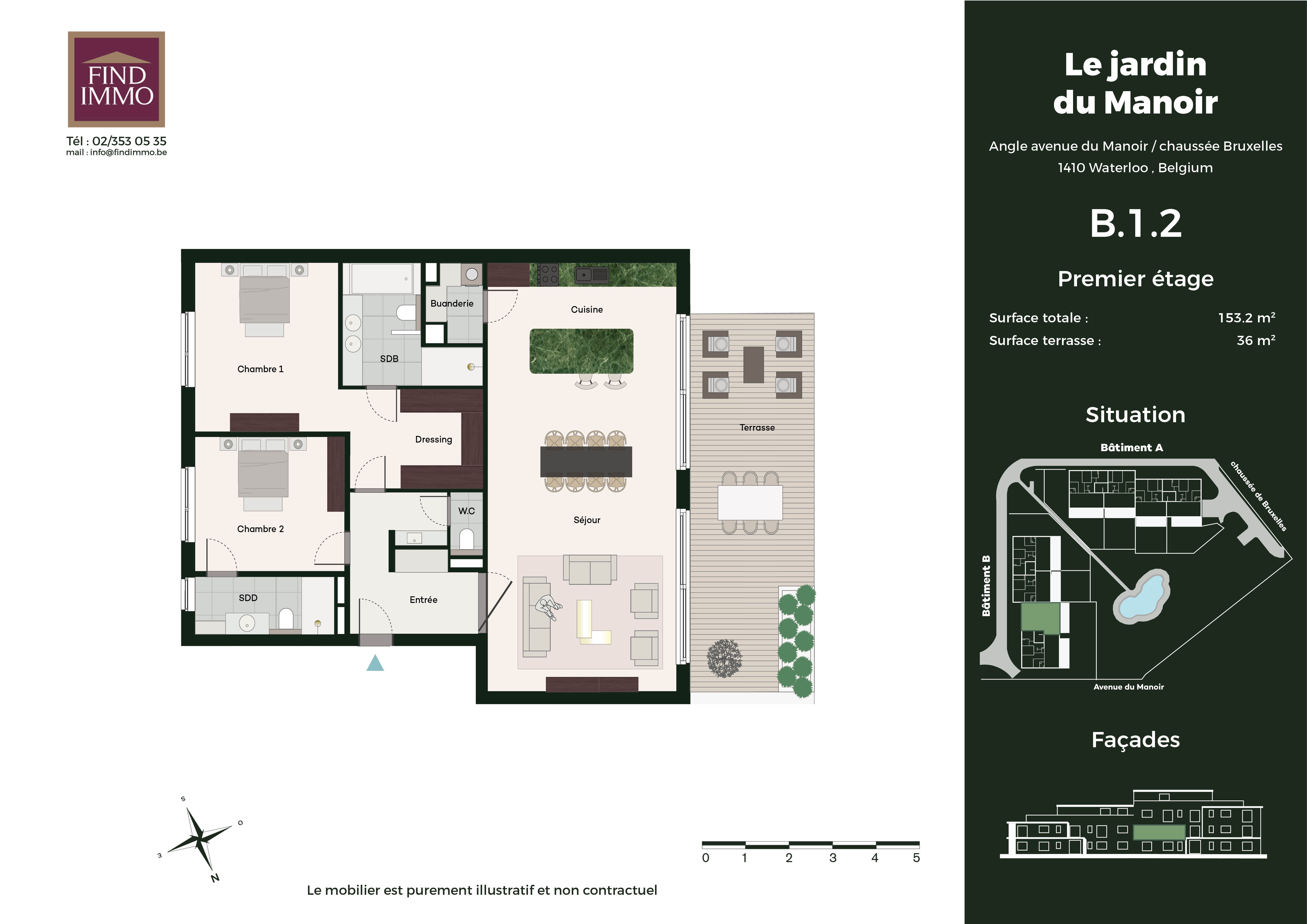 www.lejardindumanoir.be Waterloo - Quartier du Manoir - dans un nouveau projet immobilier de prestige : Appartement de 153m2 au 1er étage avec terrasse de +/-36m2. le logement se compose d'un hall d'entrée avec espace vestiaire et toilette invité, spacieux séjour ouvert sur une magnifique cuisine, buanderie, deux suites avec dressing et salle de bains ou salle de douche. Cet ensemble résidentiel offre un cadre de vie exceptionnel, alliant confort, sécurité, modernité et sérénité. Chaque appartement spacieux pensé pour offrir un bien-être optimal, dispose d'une grande terrasse et d'un jardin privatif pour les rez-de-chaussée, idéal pour profiter des beaux jours. Les résidents pourront se promener autour d'un étang pittoresque et bénéficier de chemins aménagés pour des balades. Avec des finitions luxueuses et des prestations de qualité, ce projet pourra répondre aux attentes des plus exigeants. Situé dans un quartier résidentiel calme et réputé pour son cadre de vie agréable, il allie à la perfection tranquillité et proximité des commodités. Ne manquez pas l'opportunité de vivre dans cet écrin de verdure, où chaque détail a été pensé pour vous offrir un quotidien des plus agréable. Air conditionné, chauffage au sol, triple vitrage, porte blindée, finitions haut de gamme au choix, .... Chaque appartement disposera d'un box deux voitures et d'une cave en sous-sol. N'hésitez pas à nous contacter afin de discuter de ce projet unique. FINDIMMO 02/353 05 35 - info@findimmo.be