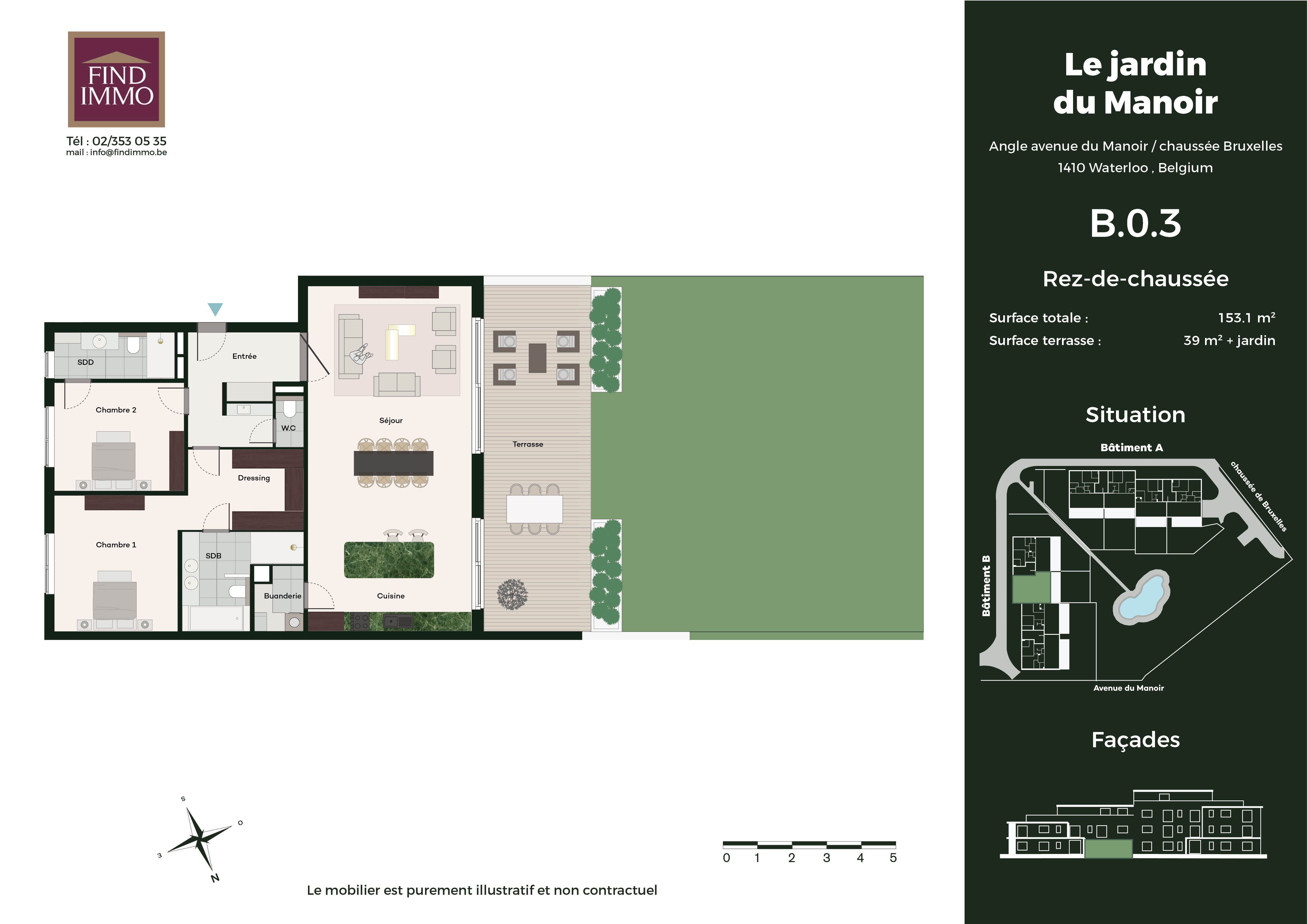 www.lejardindumanoir.be Waterloo - Quartier du Manoir - dans un nouveau projet immobilier de prestige : Appartement de 153m2 au rez-de-chaussée avec terrasse de +/-40m2 + jardin privatif de 200m2. le logement se compose d'un hall d'entrée avec espace vestiaire et toilette invité, spacieux séjour ouvert sur une magnifique cuisine, buanderie, deux suites avec dressing et salle de bains ou salle de douche. Cet ensemble résidentiel offre un cadre de vie exceptionnel, alliant confort, sécurité, modernité et sérénité. Chaque appartement spacieux pensé pour offrir un bien-être optimal, dispose d'une grande terrasse et d'un jardin privatif pour les rez-de-chaussée, idéal pour profiter des beaux jours. Les résidents pourront se promener autour d'un étang pittoresque et bénéficier de chemins aménagés pour des balades. Avec des finitions luxueuses et des prestations de qualité, ce projet pourra répondre aux attentes des plus exigeants. Situé dans un quartier résidentiel calme et réputé pour son cadre de vie agréable, il allie à la perfection tranquillité et proximité des commodités. Ne manquez pas l'opportunité de vivre dans cet écrin de verdure, où chaque détail a été pensé pour vous offrir un quotidien des plus agréable. Air conditionné, chauffage au sol, triple vitrage, porte blindée, finitions haut de gamme au choix, .... Chaque appartement disposera d'un box deux voitures et d'une cave en sous-sol. N'hésitez pas à nous contacter afin de discuter de ce projet unique. FINDIMMO 02/353 05 35 - info@findimmo.be